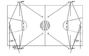 1. 宜以帶型布置于球場(chǎng)兩側(cè),并應(yīng)超出比賽場(chǎng)地端地1米。 2. 燈具安裝不應(yīng)低于是12米。 3. 以藍(lán)框?yàn)橹行闹睆?/span>4米內(nèi)的圓區(qū)上方不應(yīng)布置燈具。 4. 燈具瞄準(zhǔn)角度盡量低于65度。 5. 藍(lán)球場(chǎng)兩側(cè)正面不能布置燈具直射球場(chǎng)。 |