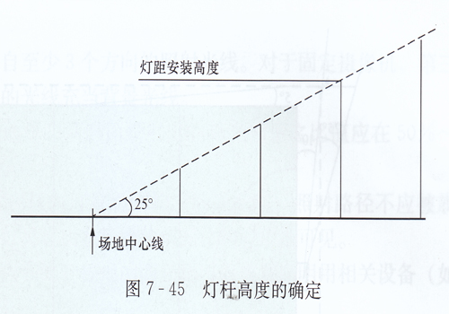 為了保證運(yùn)動(dòng)員不受眩光的影響,每個(gè)燈塔上的泛光燈的瞄準(zhǔn)角都有嚴(yán)格要求,圖7-43和圖7-44所示角度25度是最小值。