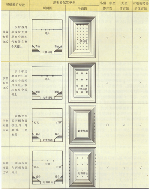 不同的運動項目會在不同大小,不同開關的運動場地進行,同時會用不同的方式來利用運動場地。運動員的活動范圍以及在運動中視野所覆蓋的范圍也不盡相同。體育場館場地照明燈具應服務好這些運動項目,滿足它們的需求。因此,在綜合考慮運動項目特點,運動場地特征的基礎上合理布置燈具,以獲得良好的照明水平,,避免對運動員和電視轉播造成不利影響。