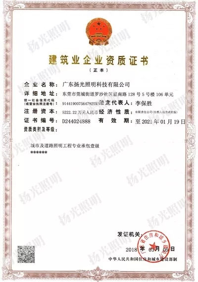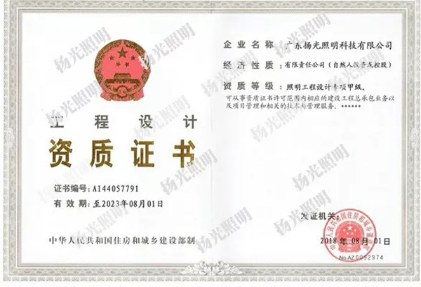 近日,揚光照明成功取得了由國家住房與城鄉建設部頒發照明工程設計專項資質甲級,至此,公司已成為全國為數不多的城市及道路照明工程施工壹級,照明工程設計專項資質甲級的“雙甲”企業,“雙甲”資質的取得體現了行業和市場對公司綜合實力的高度認可,意味著可以承接任何規模的照明設計與施工項目。